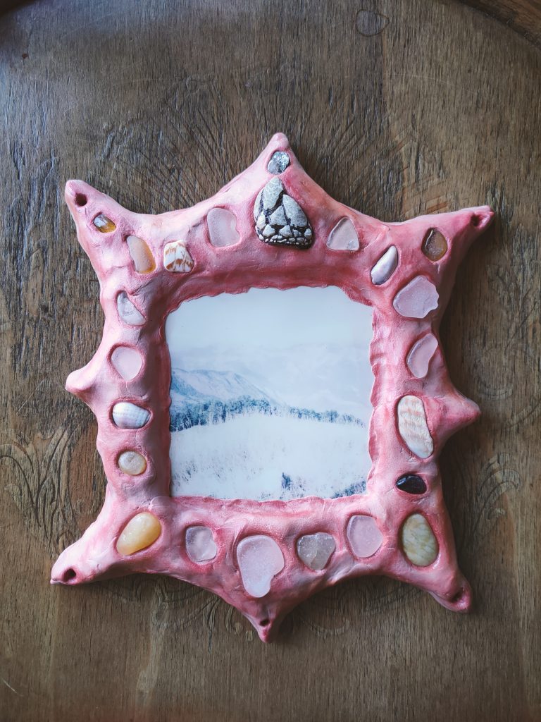 Les cadres sont fait dans une pâte autodurcissante que je modèle, puis j’y incruste de petits objets,